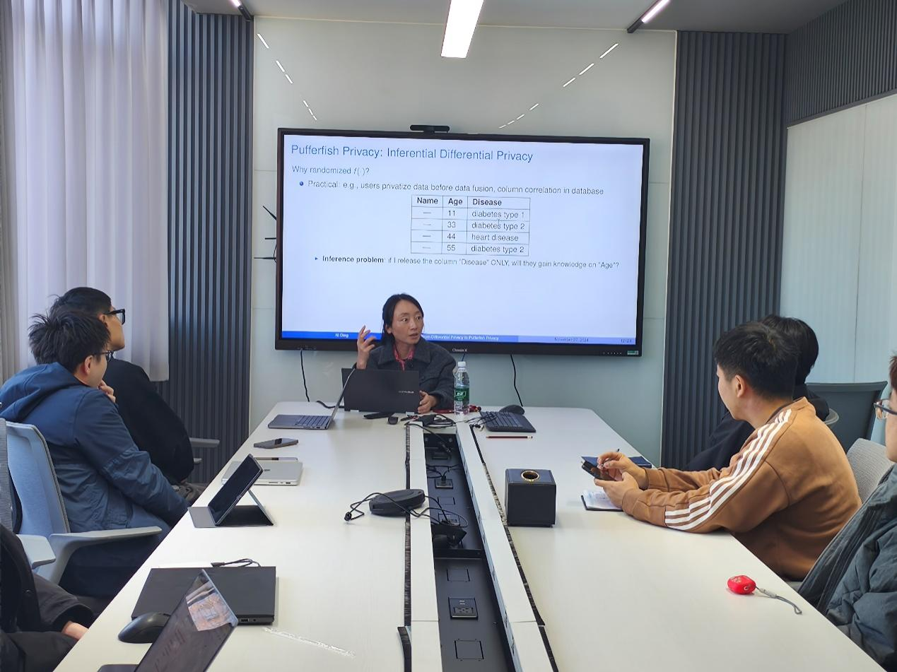 2024年11月27日,奥克兰大学丁妮博士应北京理工大学计算机学院邀请,在中心教学楼举分别作题为“隐私泄露与机器学习中的Rényi度量新解释”、“通过Kantorovich最优传输计划实现ε-Pufferfish隐私”的学术讲座,,讲座分别由计算机学院礼欣老师、胡晶晶老师主持,语言智能与社会计算研究所和网络攻防对抗研究所相关专业方向师生参加了讲座。