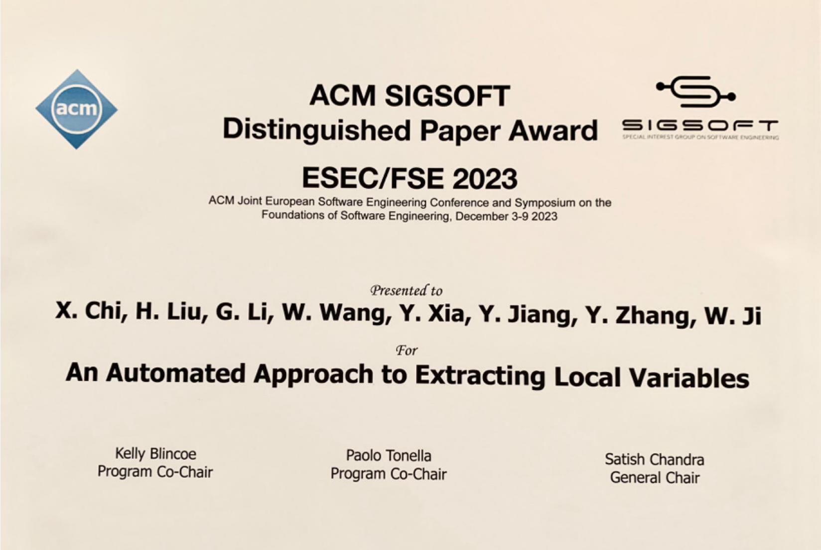 2023年12月3日至9日,第31届ACM软件工程基础国际会议 (简称ESEC/FSE) 在美国加利福尼亚召开。北理工计算机学院智能软件与软件工程研究所刘辉、张宇霞课题组的论文“An Automated Approach to Extracting Local Variables”获本届会议的杰出论文奖。ESEC/FSE和ICSE是软件工程领域最有影响力历史最悠久的旗舰学术会议。刘辉课题组2022年获得CCF A类会ICSE 2022杰出论文奖,本年度再次获得CCF A类国际会议的杰出论文奖。