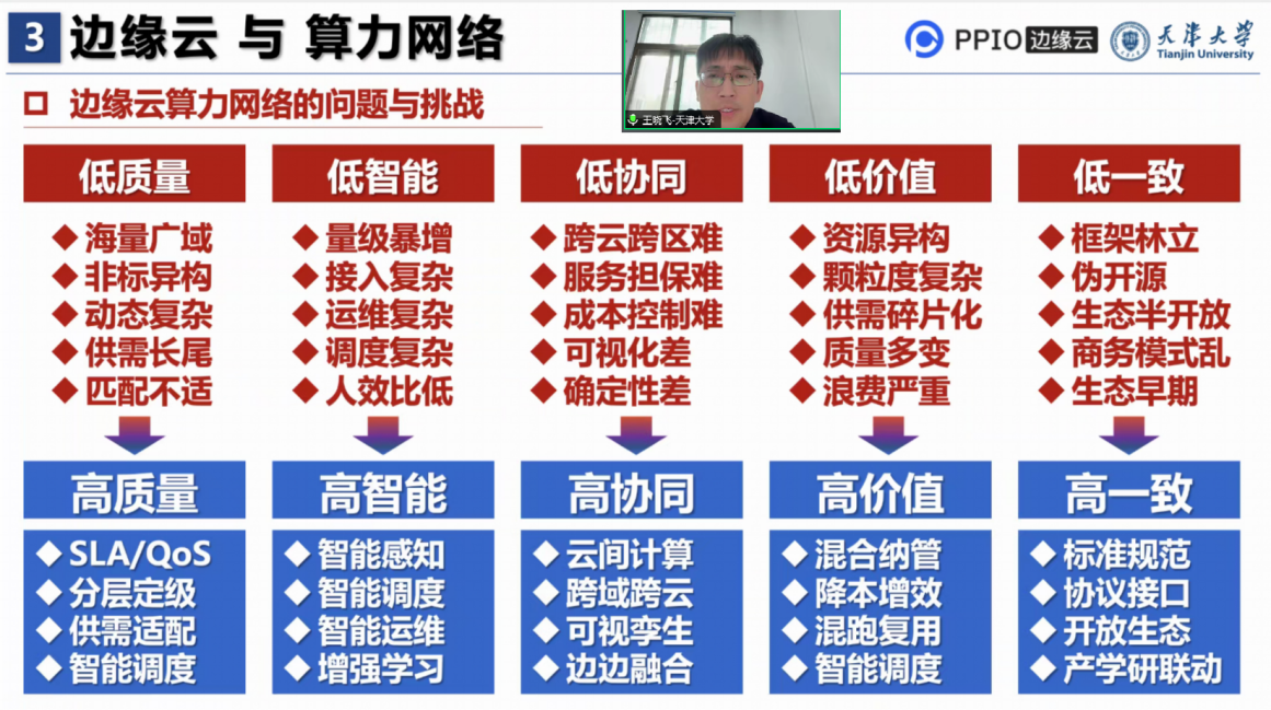 大模型技术掀起了通用人工智能时代的巨幕,而如何建设低时延、高效能、泛在弹性的算力基础设施以支持大模型训练推理和持续迭代成为了核心问题之一。王晓飞教授介绍了边缘云与算力网络的发展历史、现状、趋势,并指出未来分布式网络有大小模型混合发展、训推融合部署、算力与网络协同发展的必然趋势,同时介绍了边缘云与算力网络近来面对的任务颗粒越来越碎片化、算力需求越来越多维异构、时延要求越来越高等挑战。在此次报告中,王晓飞教授从智能调度、服务保障、供需预测、算力交易等角度分享有关科研进展,并且分享了真实场景收集的边缘云算力网络基础设置与业务预测等数据集。最后,王晓飞教授还介绍了以 PPIO 为代表的相关产学研合作落地应用。