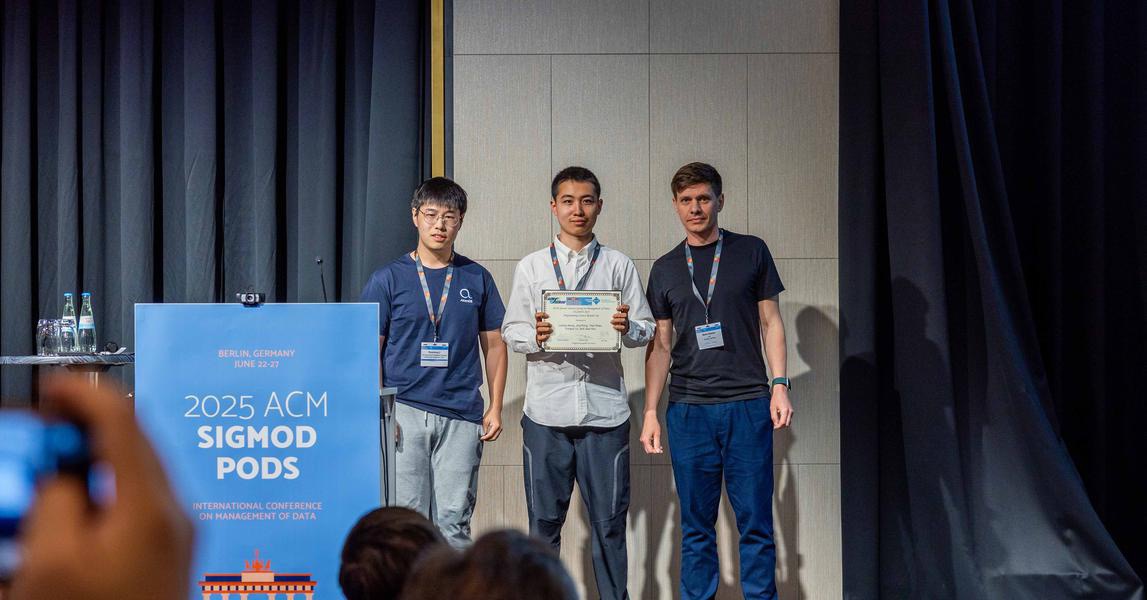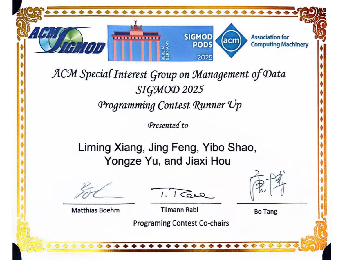 2025年6月,数据库领域全球顶级学术会议SIGMOD 2025在德国柏林落幕。经过激烈角逐,韩国AV 硕士研究生项黎明、封璟,本科生邵艺博、侯佳希以及来自西安电子科技大学的俞泳泽组成的Kirara队在秦宏超、李荣华、王国仁老师的指导下,获得了编程竞赛全球亚军(Programming Contest Runner Up Award),这是北理工学子首次参加该赛事。本次竞赛冠军由慕尼黑工业大学(TUM)团队夺得,清华大学团队位列第三。