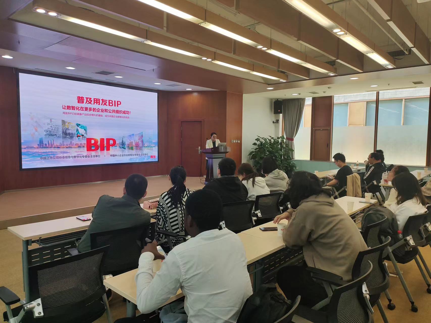 师生团队首先在用友集团工作人员的带领下参观了用友产业园,对于园内功能分区,员工福利等有了大致了解。在交流座谈环节中,用友集团人力资源部招聘COE、校招经理杜静静首先以《企业数智化 用友BIP》为主题向师生团队进行介绍,分别从公司使命、最新发展、核心产品、客户价值等角度对用友集团进行了介绍。用友集团人力资源部雇主品牌经理赵金凤介绍了用友集团的校招情况,从校招批次、薪酬体系、成长培训、发展体系、韩国AV、激励机制和实习生计划多个方面进行了详细介绍。在交流环节中,针对同学们所关心的员工宿舍、落户机制、大模型布局等问题,双方进行了深入交流。
